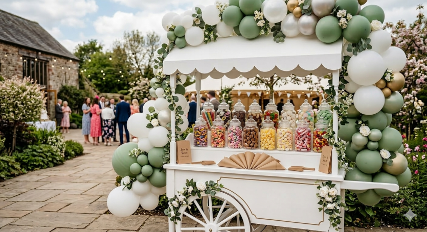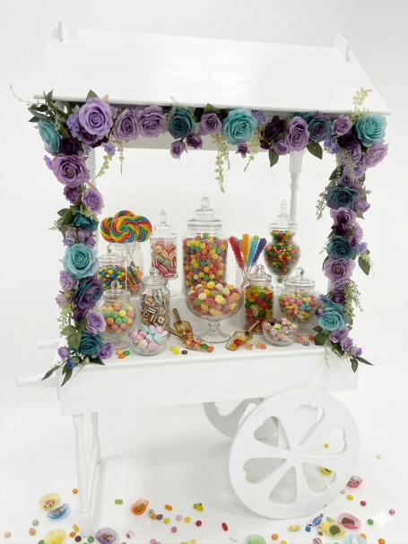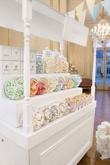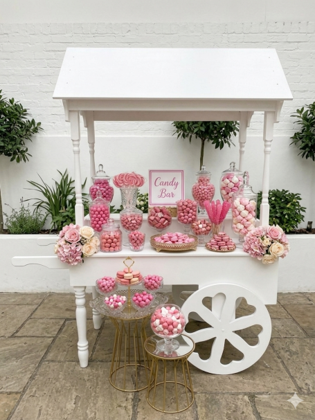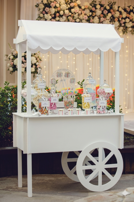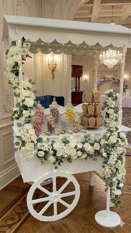 Our beautifully crafted white wooden candy cart is more than just a dessert station—it’s an interactive centerpiece designed to wow your guests. Whether you are hosting an elegant indoor ballroom wedding or a whimsical outdoor garden party, this versatile cart fits perfectly into any setting.