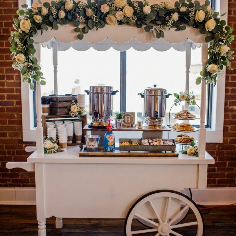 Transform your coffee cart into a full breakfast or snack station. This is a high-impact add-on for morning meetings or bridal suites while the wedding party is getting ready.
